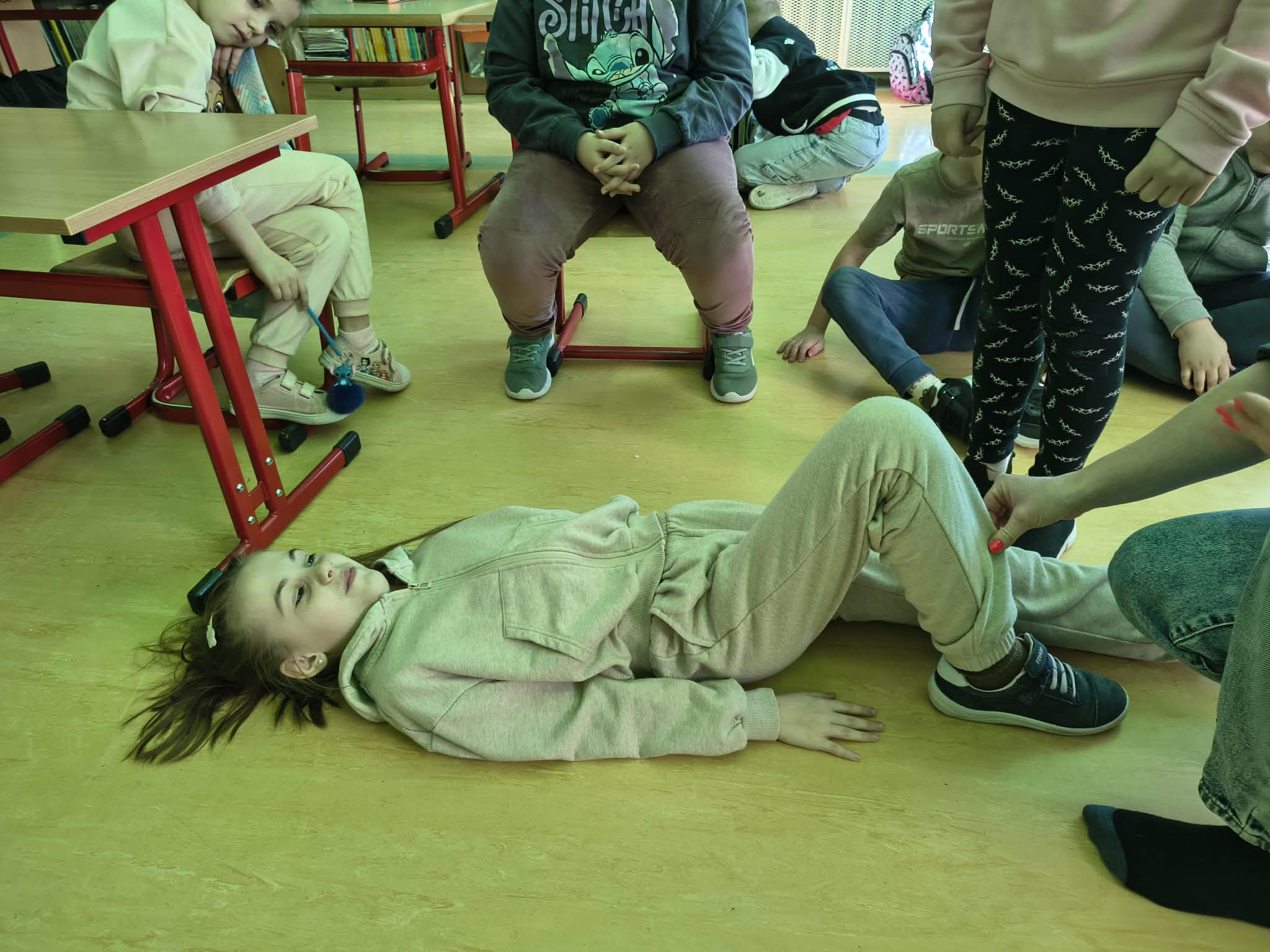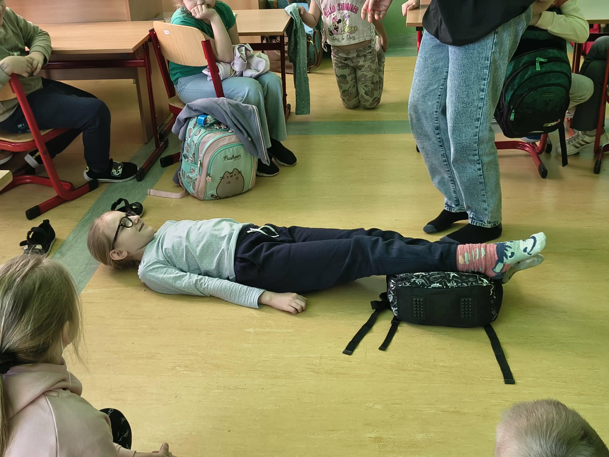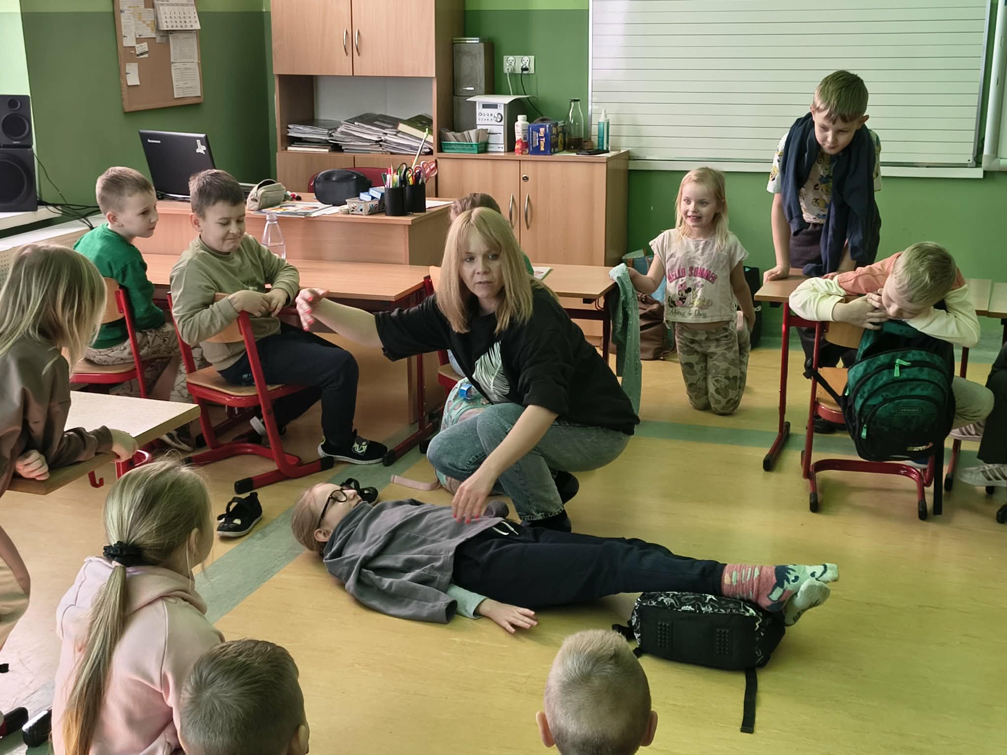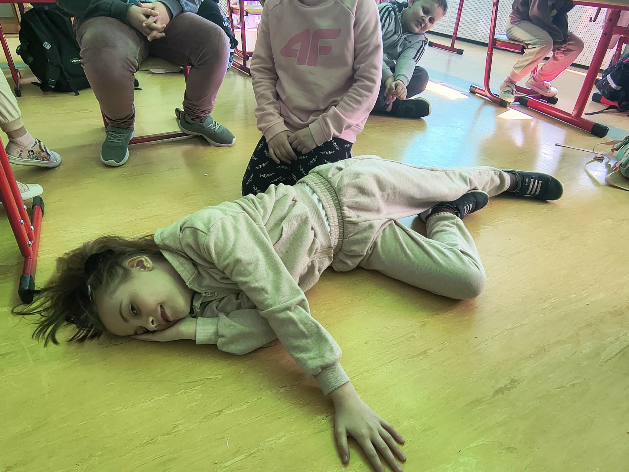 Każdy uczeń miał okazję samodzielnie przećwiczyć układanie poszkodowanego w pozycji bocznej bezpiecznej. Dzieci dowiedziały się, kiedy należy ją zastosować i dlaczego jest ona tak ważna dla bezpieczeństwa osoby nieprzytomnej.