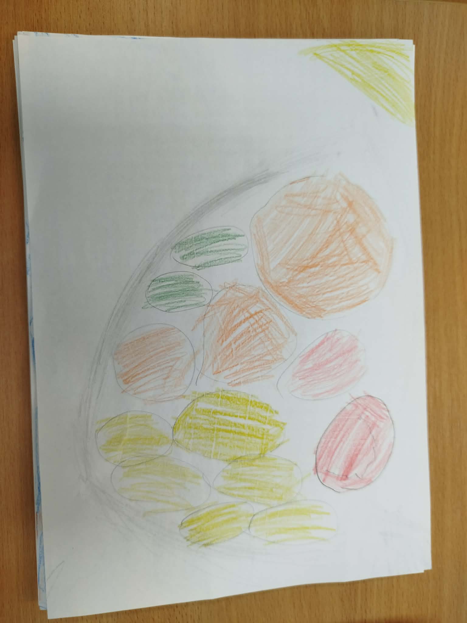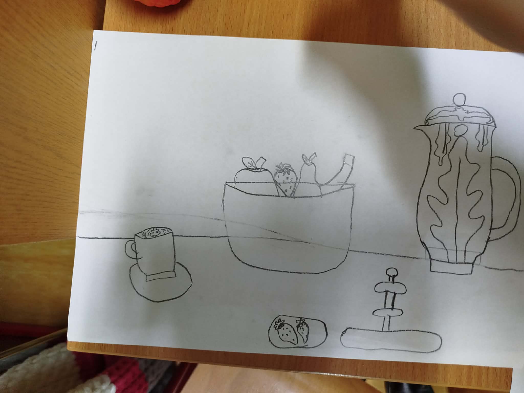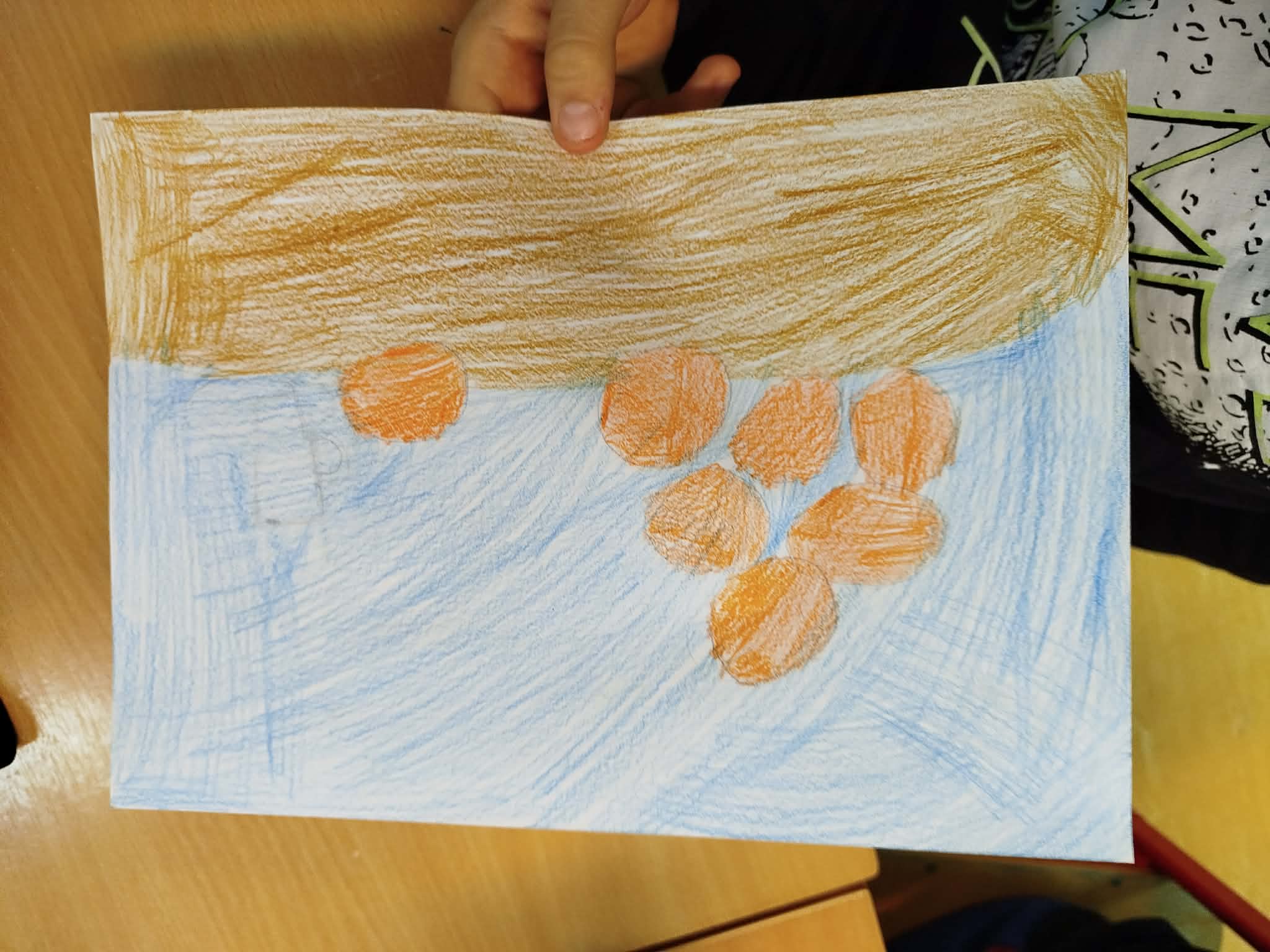 Uczniowie malowali martwą naturę kredkami, zwracając uwagę na: