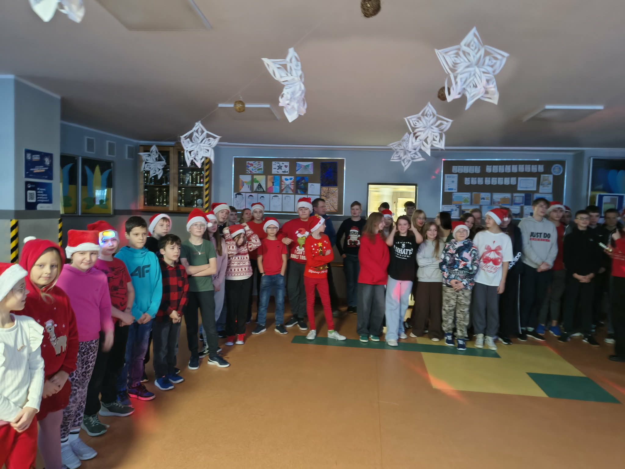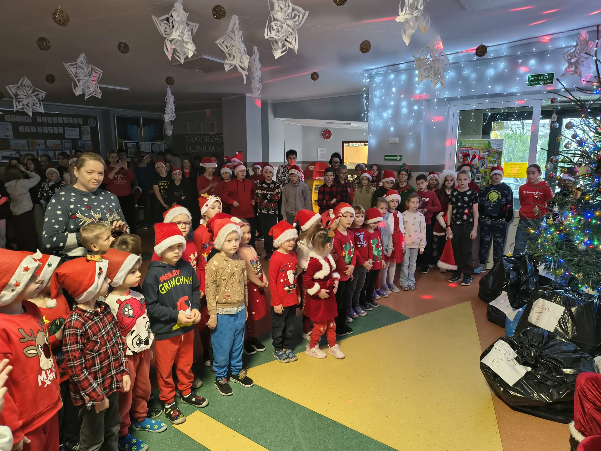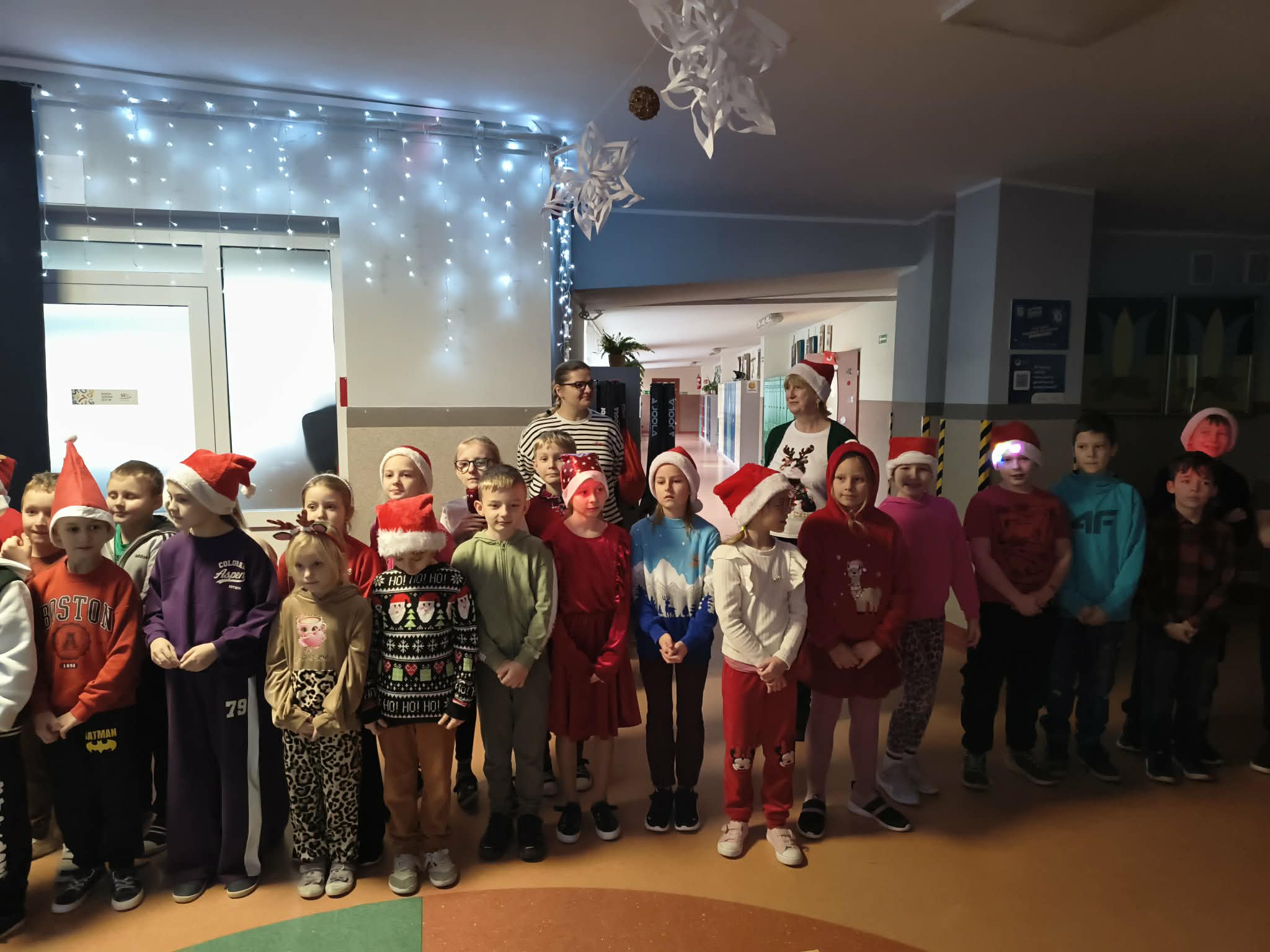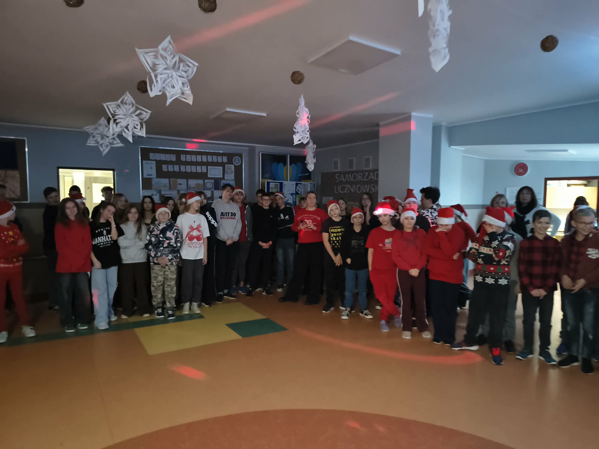 Było wesoło i radośnie — rozbrzmiewały kolędy, a szkolny korytarz wypełnił się uśmiechami i świątecznym nastrojem. Uczniowie ubrani na czerwono, w mikołajkowych czapkach, wyglądali naprawdę wyjątkowo!
