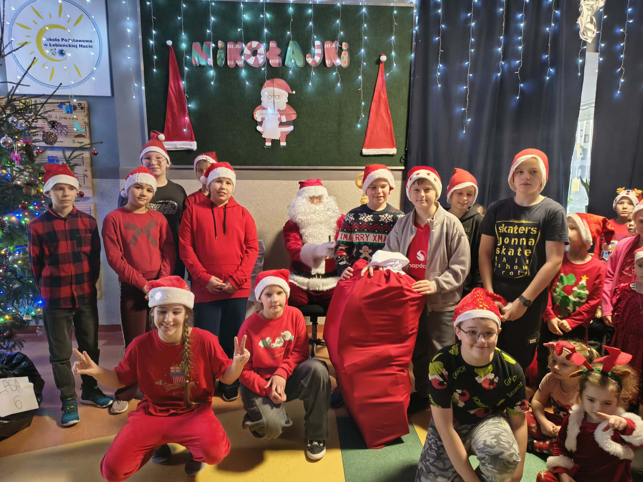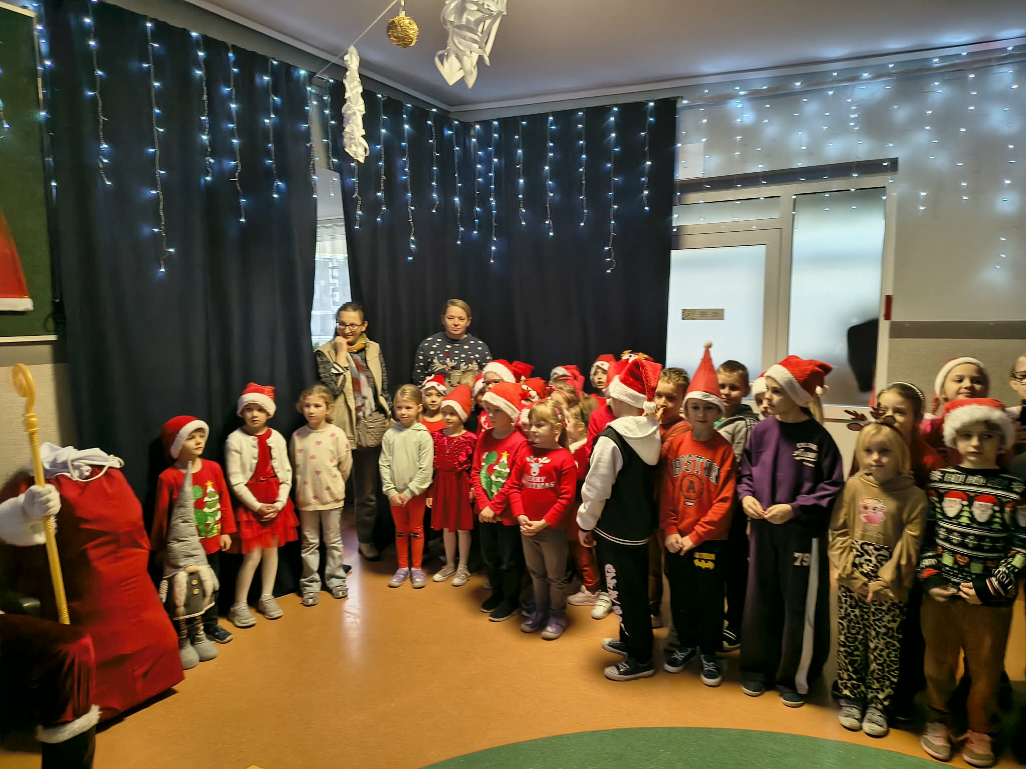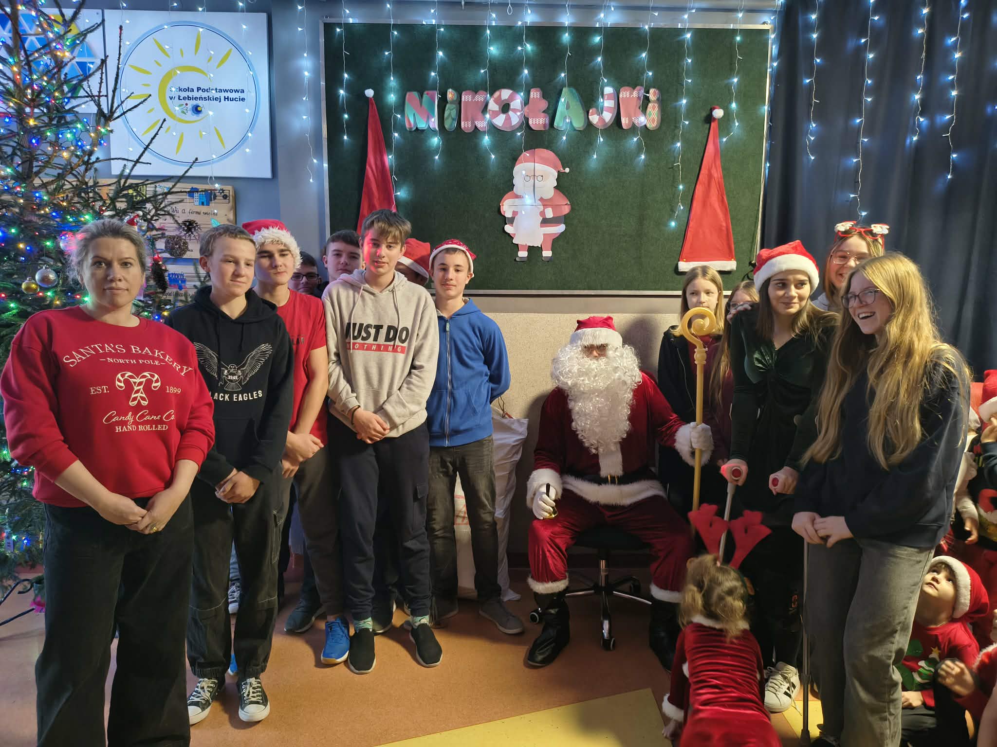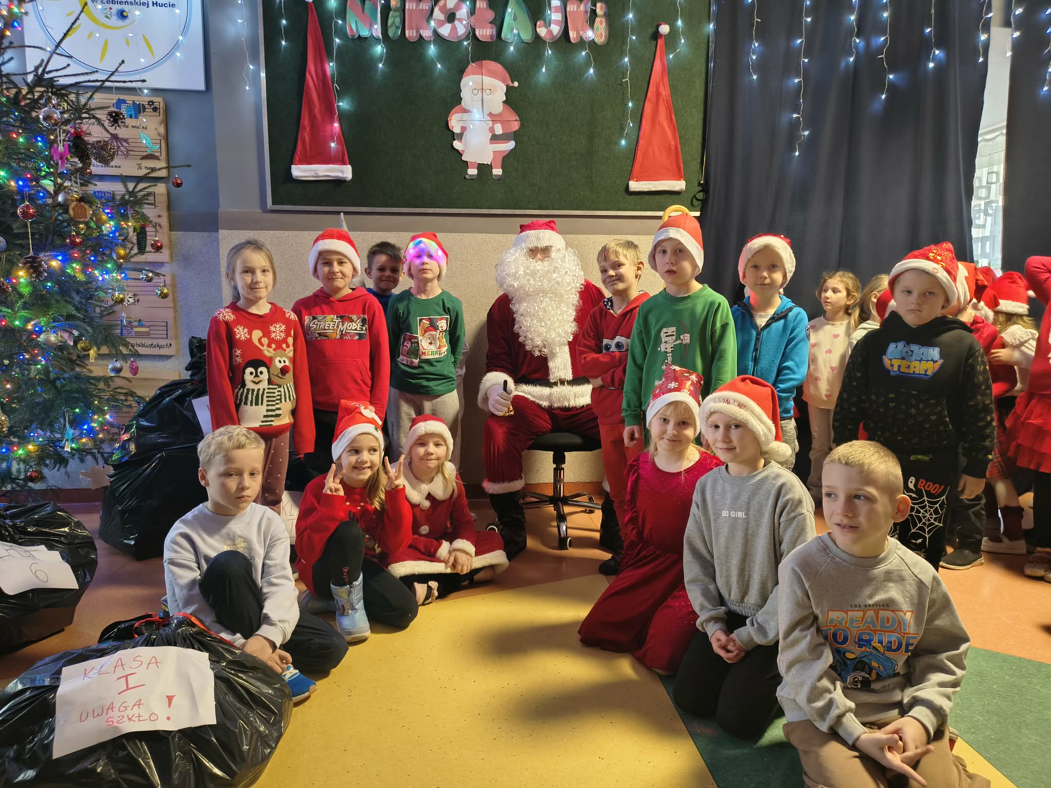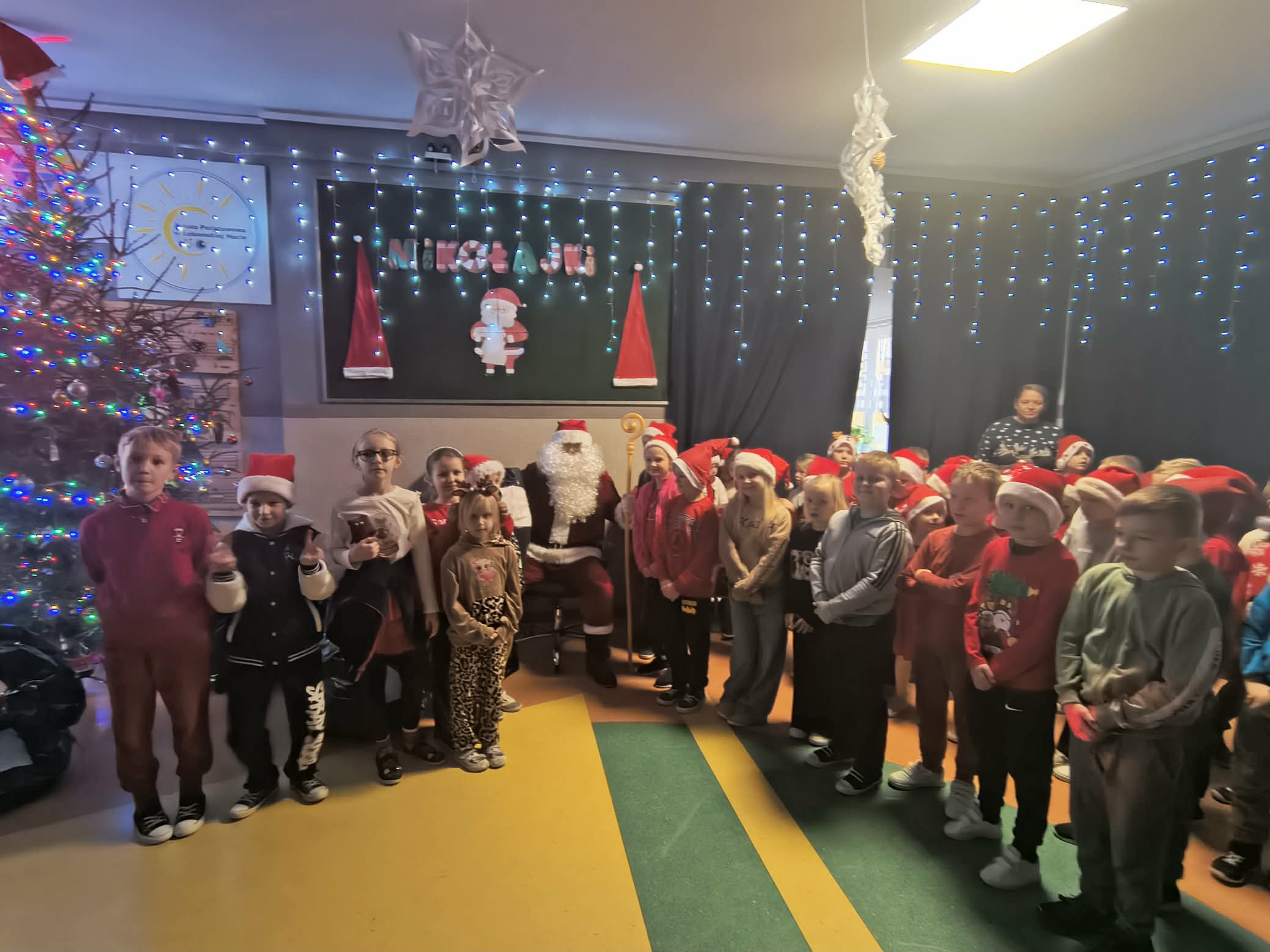Było wesoło i radośnie — rozbrzmiewały kolędy, a szkolny korytarz wypełnił się uśmiechami i świątecznym nastrojem. Uczniowie ubrani na czerwono, w mikołajkowych czapkach, wyglądali naprawdę wyjątkowo!