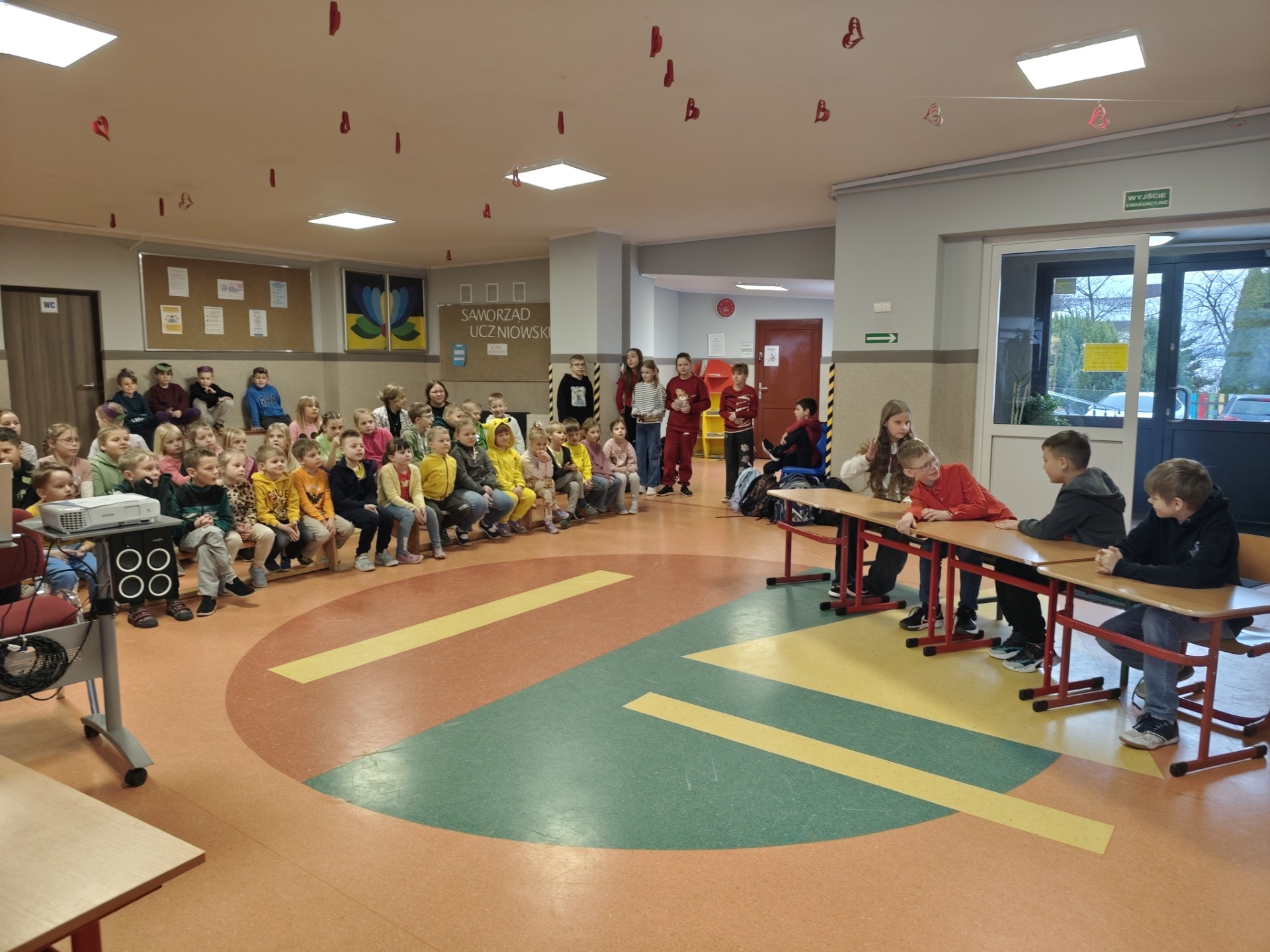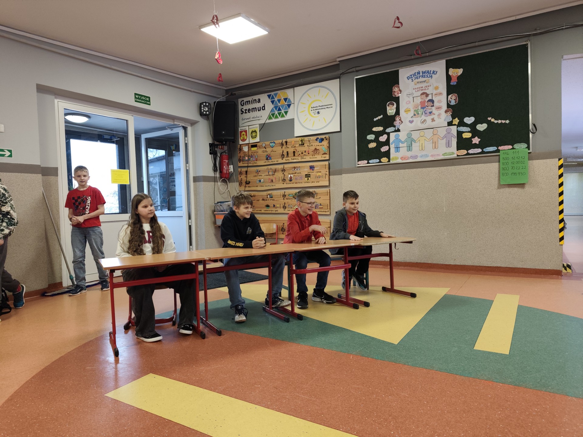 Czwartoklasiści zaprezentowali również krótką scenkę sytuacyjną, pokazującą, jak może czuć się osoba zmagająca się z obniżonym nastrojem oraz jak ważna jest uważność, empatia i reagowanie na niepokojące sygnały wśród rówieśników. Tego dnia uczniowie przyszli ubrani w wylosowane wcześniej kolory – każda klasa miała inny kolor stroju. Choć symbolem depresji jest kolor zielony, zależało nam na podkreśleniu różnorodności emocji i doświadczeń. Kolory stały się symbolem wspólnoty, solidarności i wsparcia – pokazaliśmy, że razem tworzymy bezpieczną, wspierającą się społeczność.