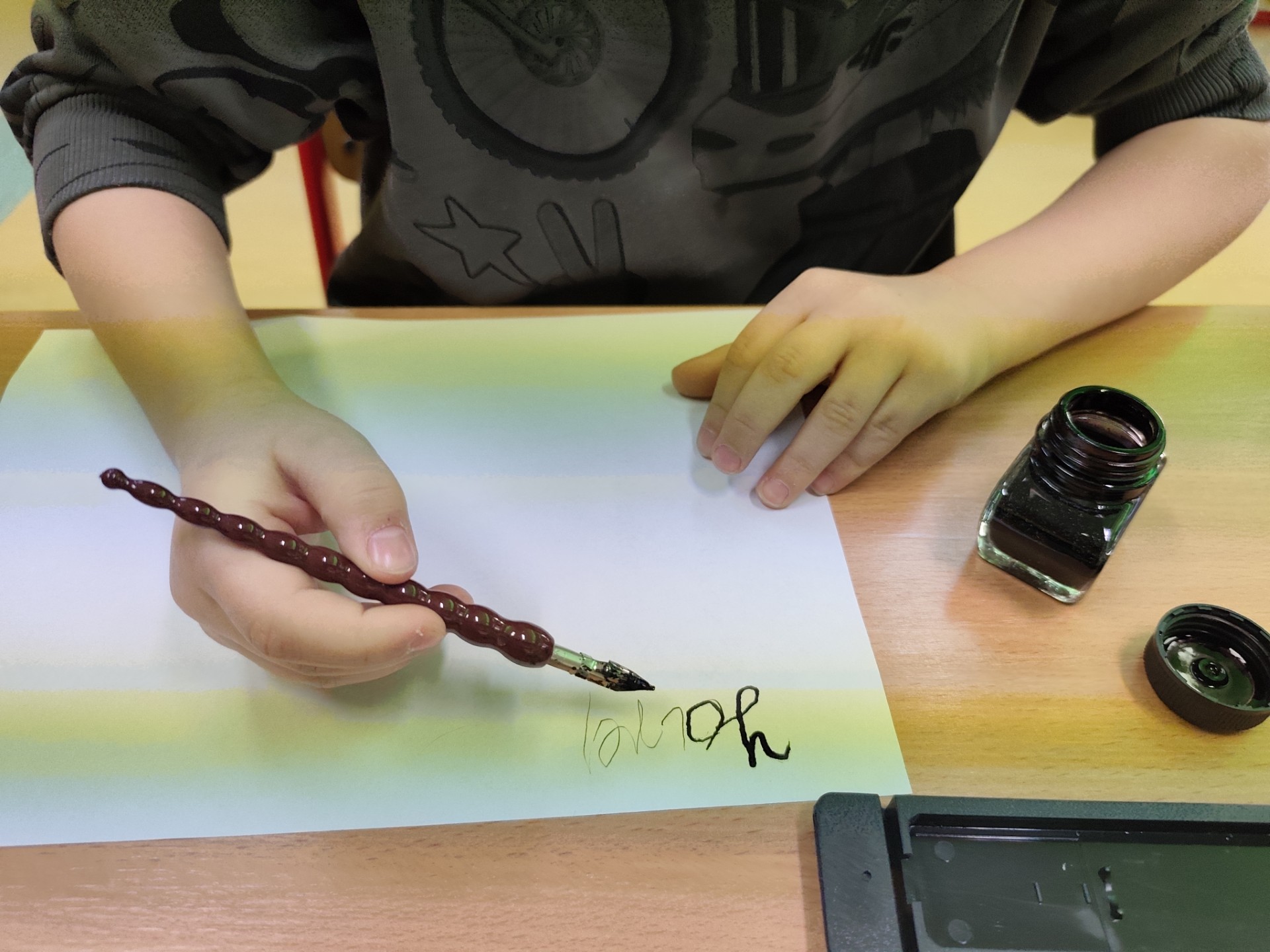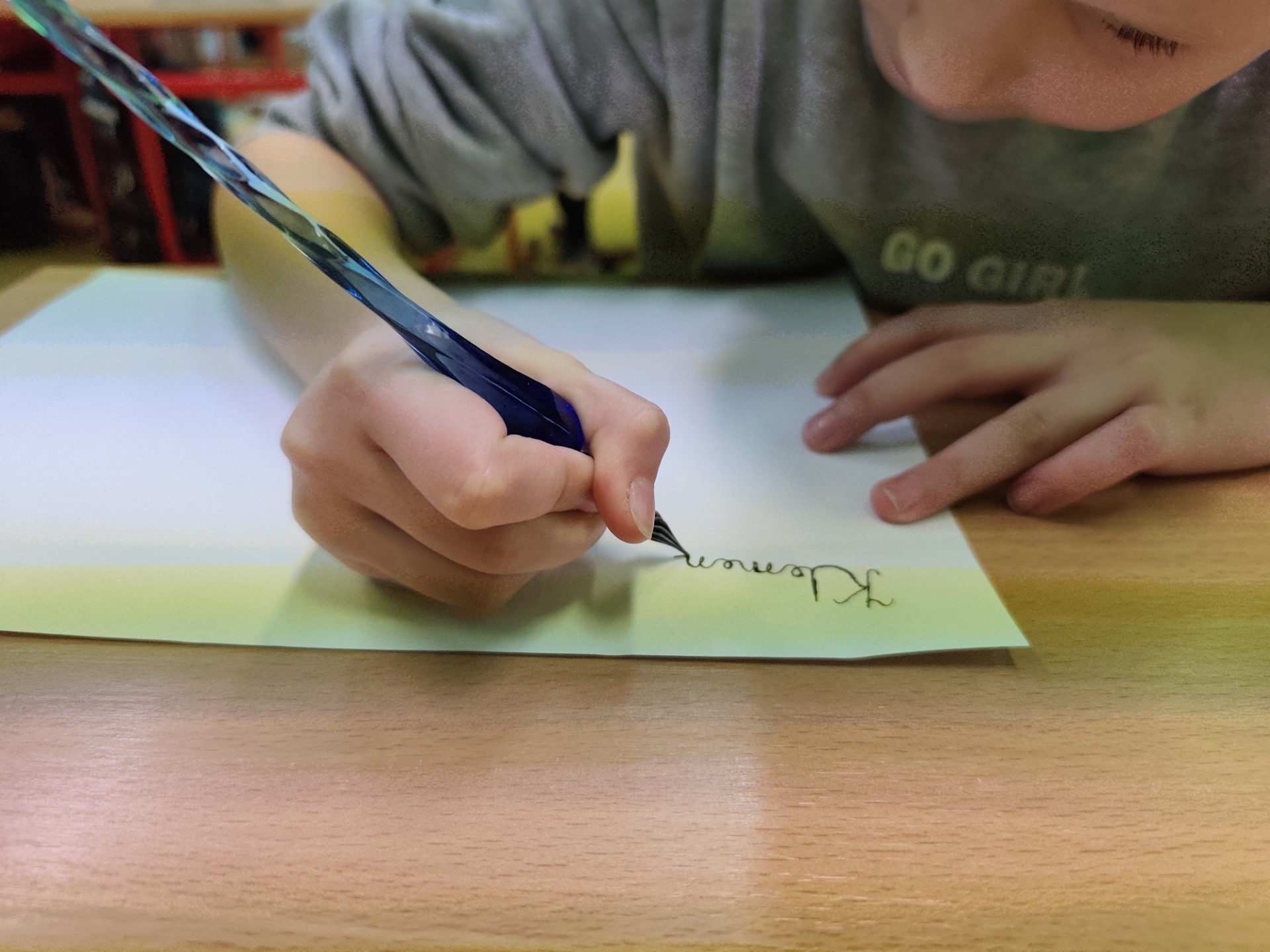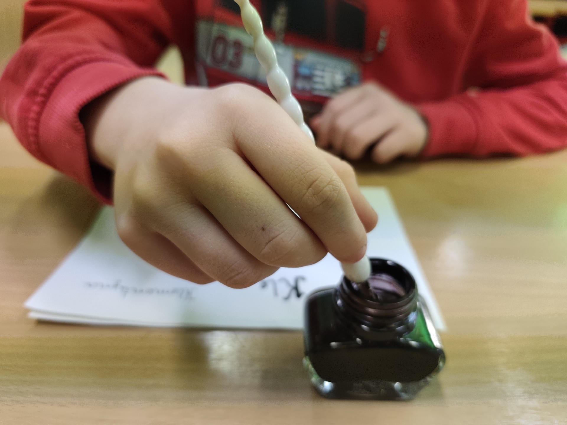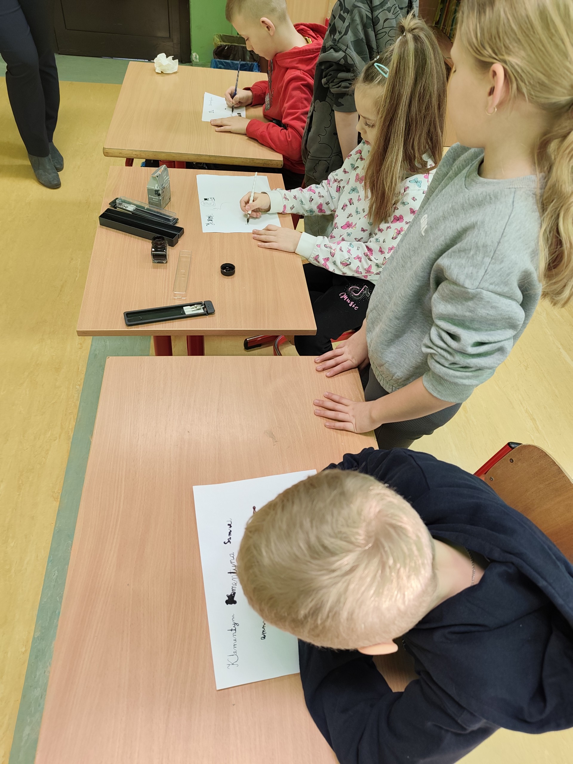 Podczas zajęć mieli okazję spróbować pisania piórami maczanymi w atramencie, co okazało się nie lada wyzwaniem.