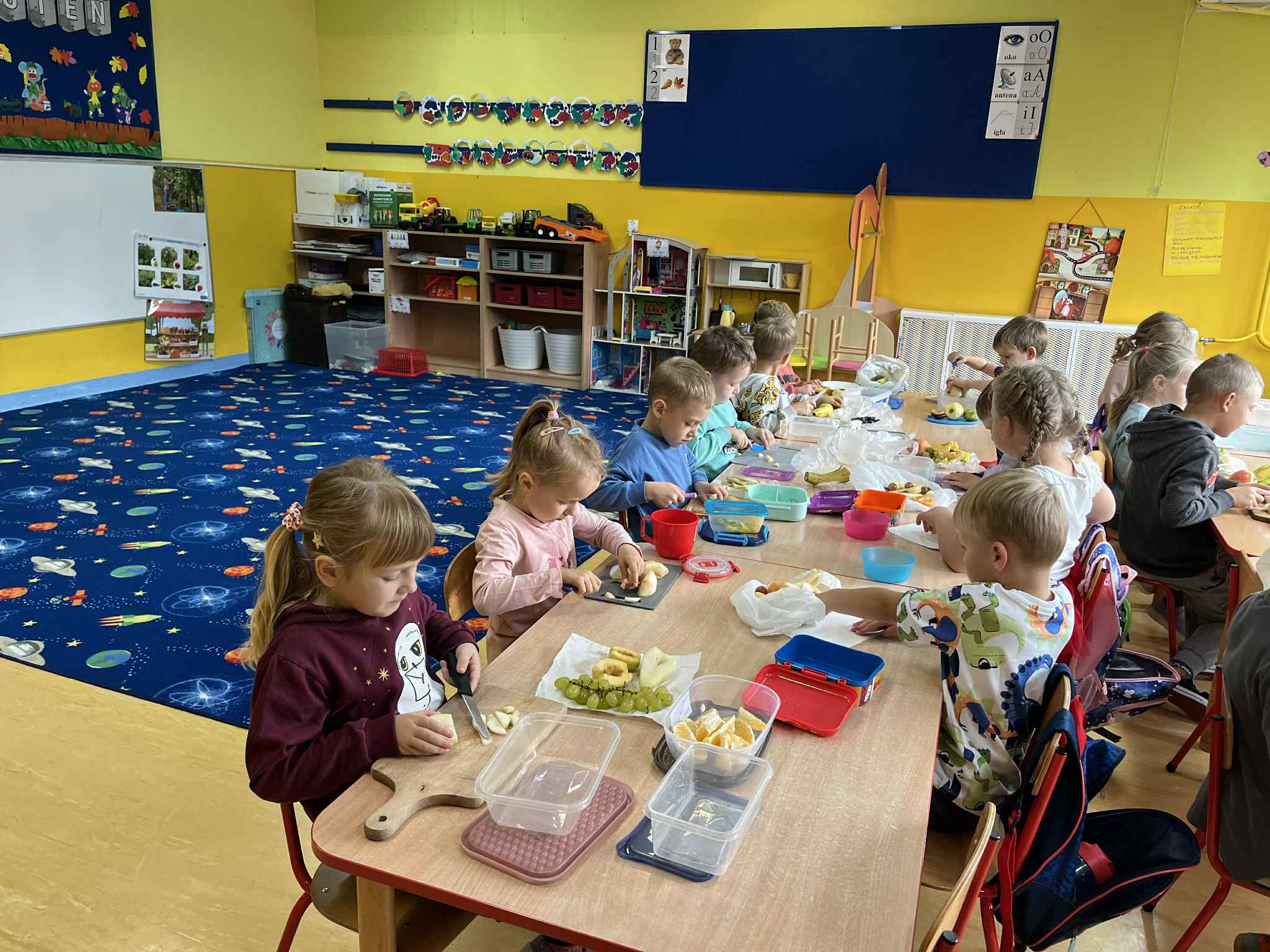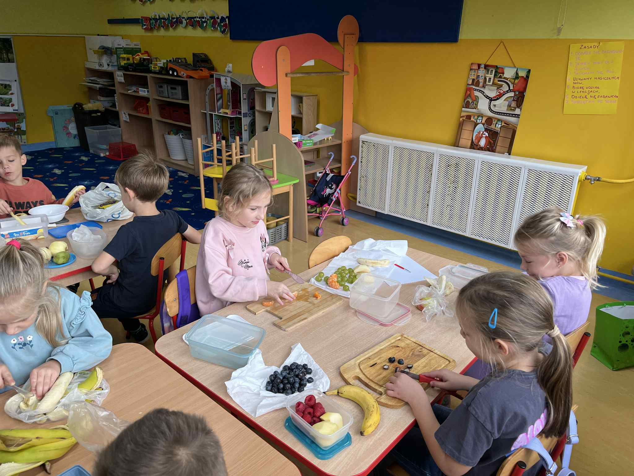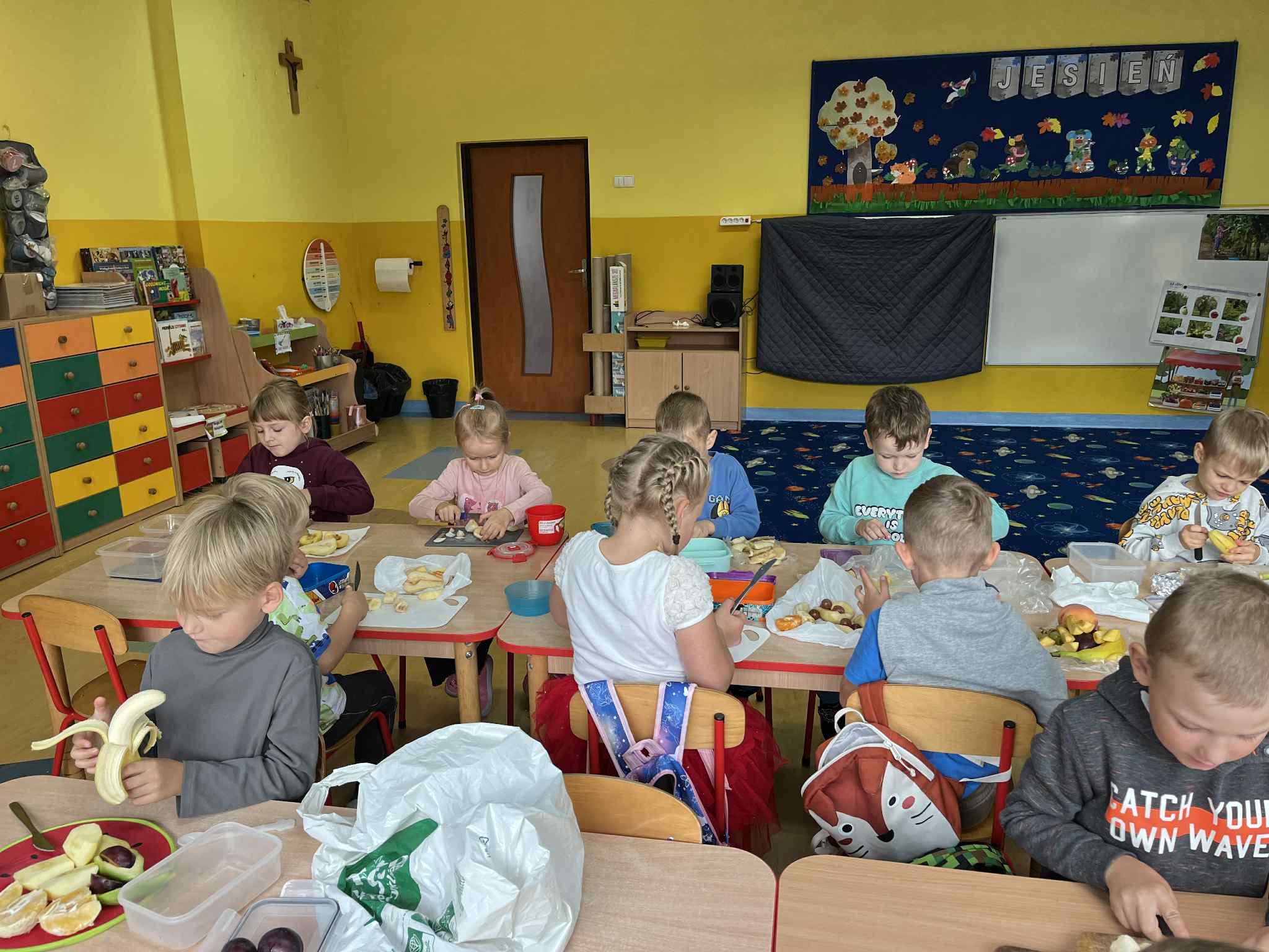 Na zakończenie tygodnia przygotowaliśmy wspólnie pyszną sałatkę owocową z jabłek, gruszek, śliwek, winogron i innych sezonowych owoców. Dzieci z ogromnym apetytem zajadały się swoim własnoręcznie przygotowanym deserem.