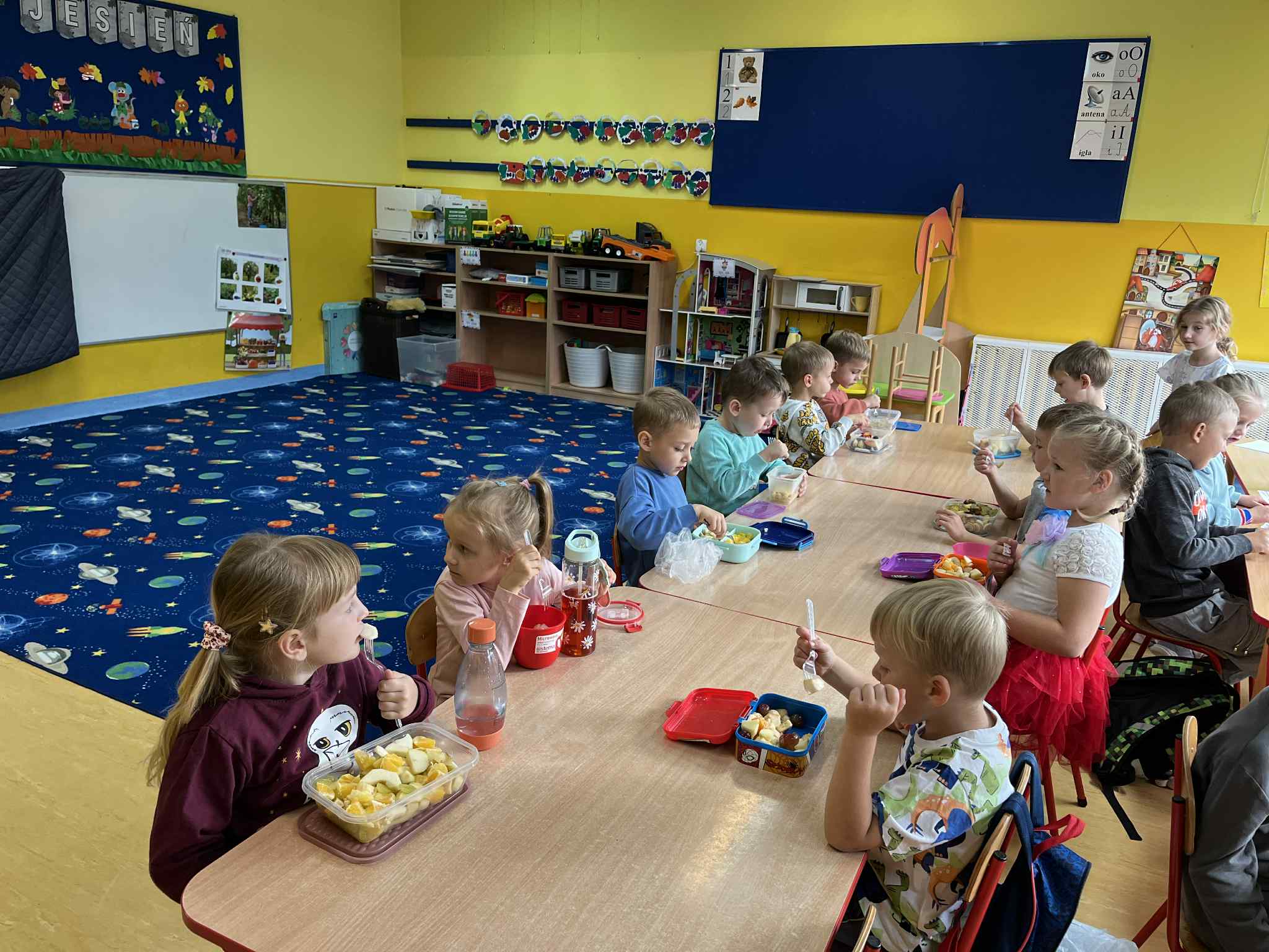 W tym tygodniu rozmawialiśmy o owocach, które rosną w naszych polskich sadach. Poznaliśmy ich nazwy, kształty, kolory oraz smaki. Dzieci dowiedziały się, jakie owoce rosną w Polsce, jak wygląda ich dojrzewanie oraz dlaczego warto je jeść. Zastanawialiśmy się również, co można zrobić z owoców – wspólnie wymieniliśmy takie przysmaki jak: dżemy, kompoty, soki, ciasta, a nawet suszone owoce. Rozmawialiśmy też o witaminach – dzieci dowiedziały się, że owoce są bogatym źródłem witaminy C, witamin z grupy B, a także błonnika i składników mineralnych, które wspierają odporność i zdrowy rozwój. W ramach zajęć plastycznych wykonaliśmy kreatywnego jeża z gruszki i winogron, co sprawiło dzieciom dużo radości.