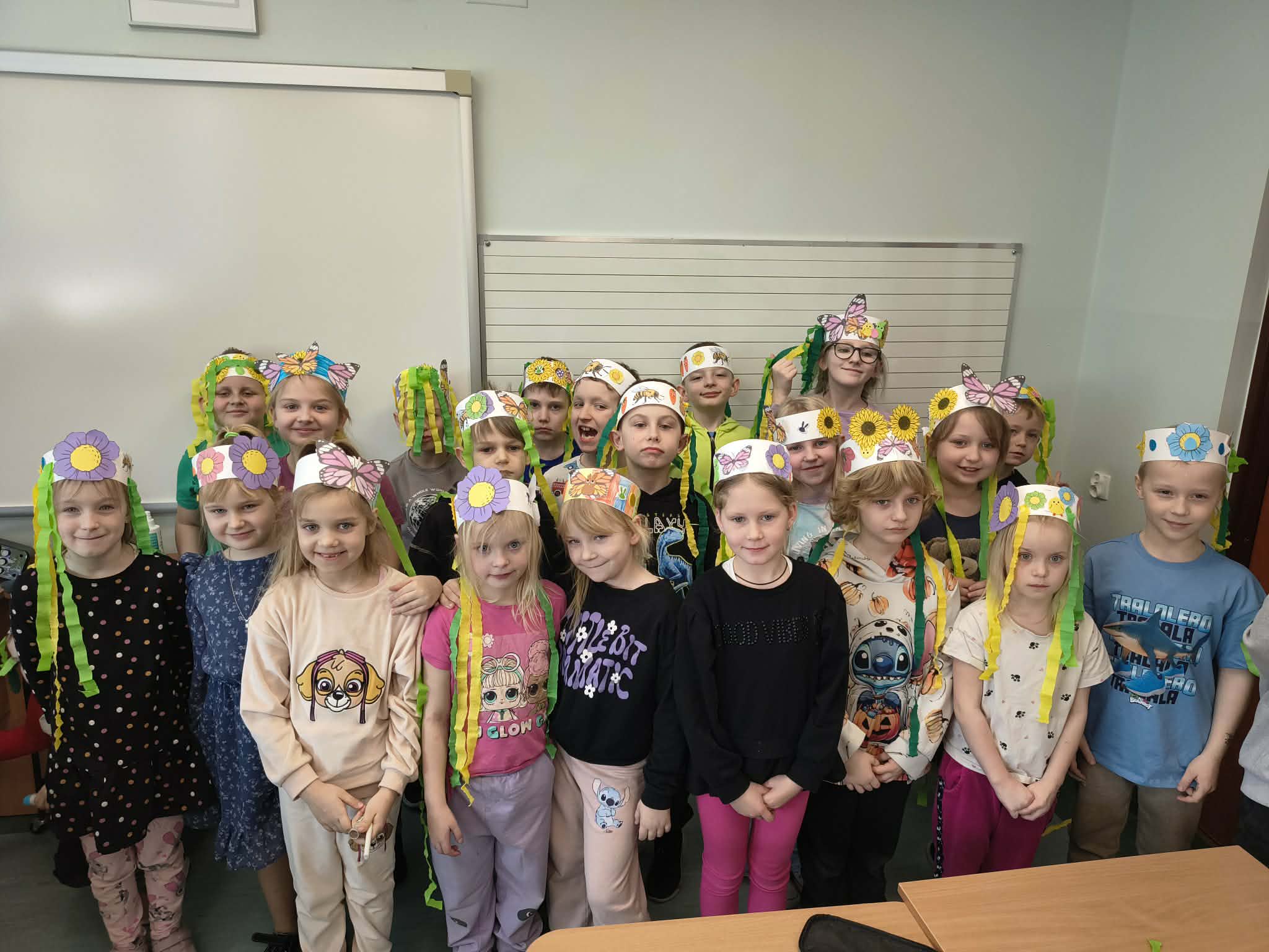 Dzieci pracowały w grupach, przygotowując kolorowy napis „Wiosna”, oraz wyczarowały przepiękne opaski, które ozdobiły ich głowy podczas wiosennego korowodu.