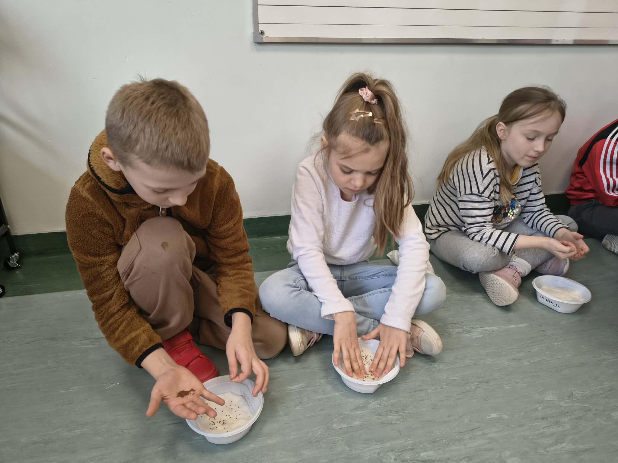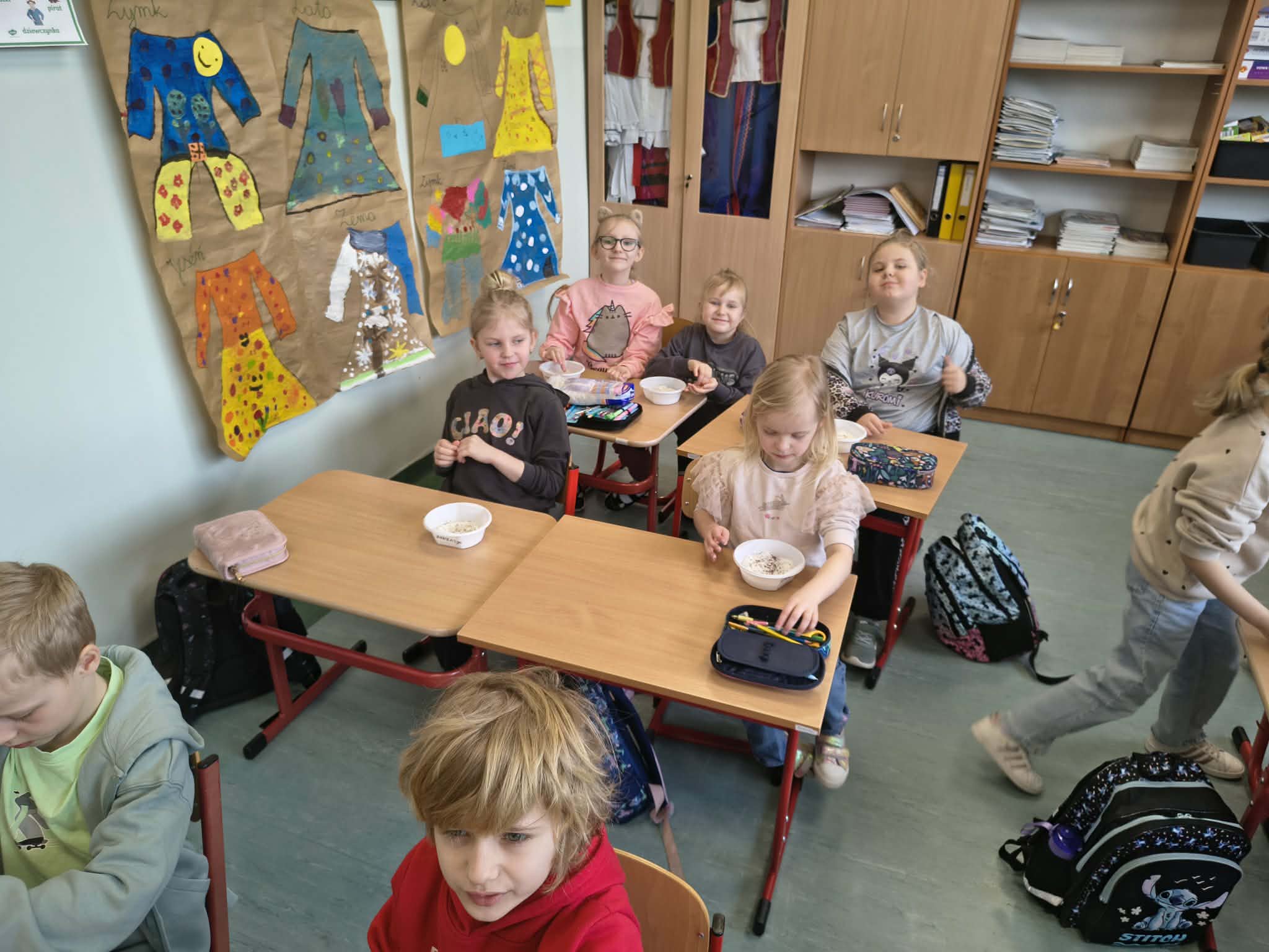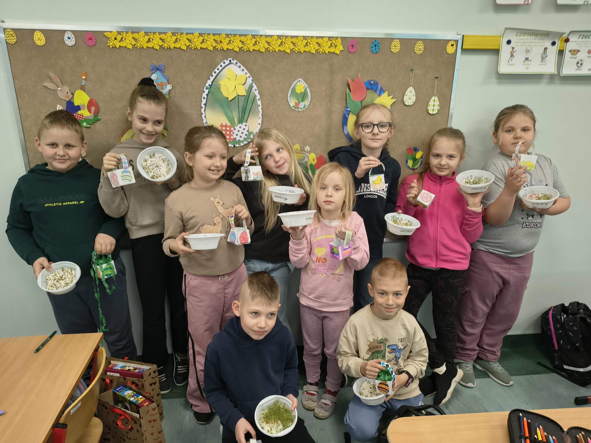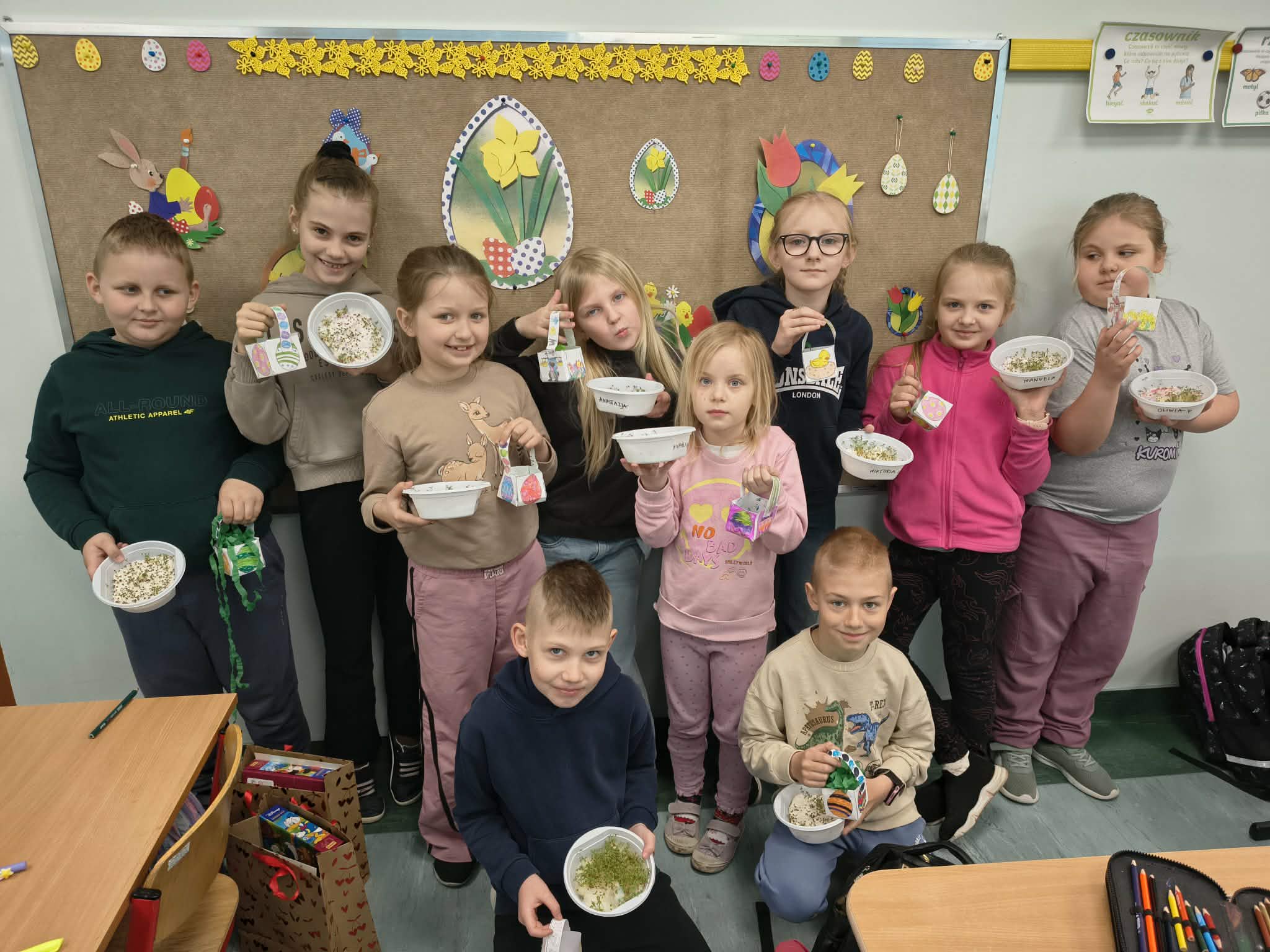 Nie zabrakło też akcentów przyrodniczych i świątecznych – każdy uczeń z zaangażowaniem siał rzeżuchę oraz własnoręcznie wykonał uroczy koszyczek wielkanocny,