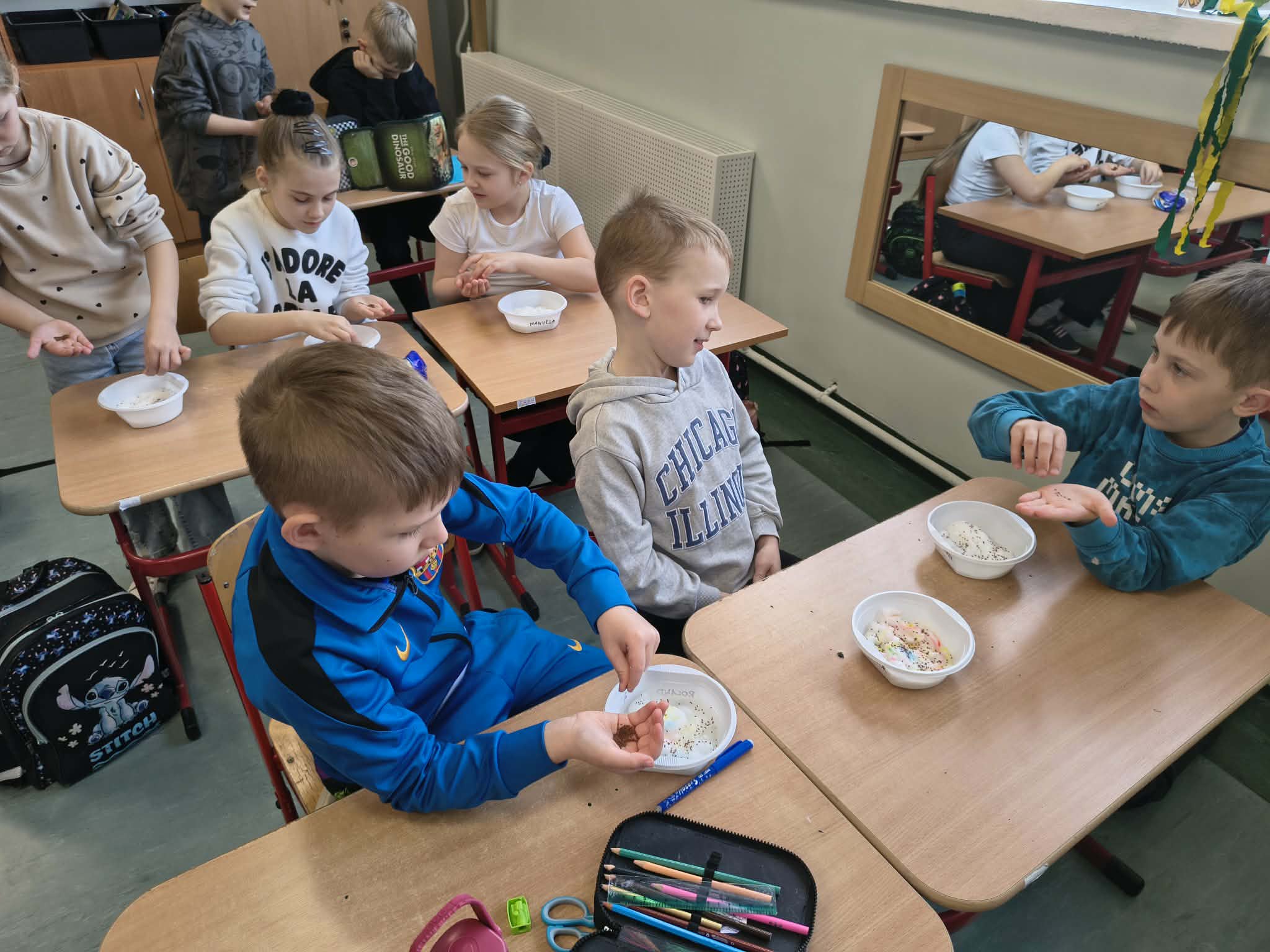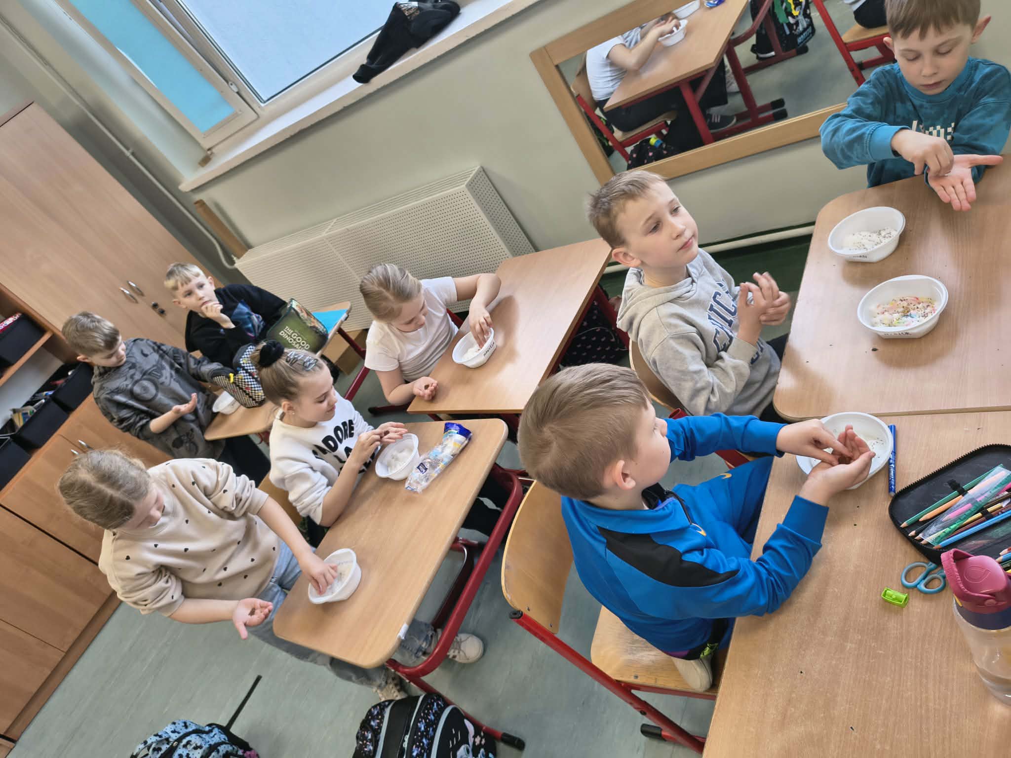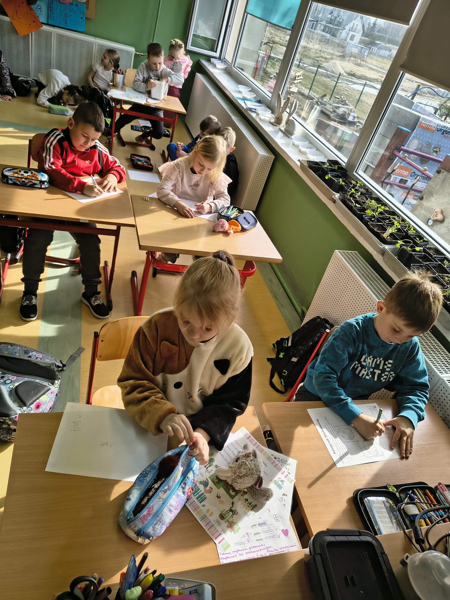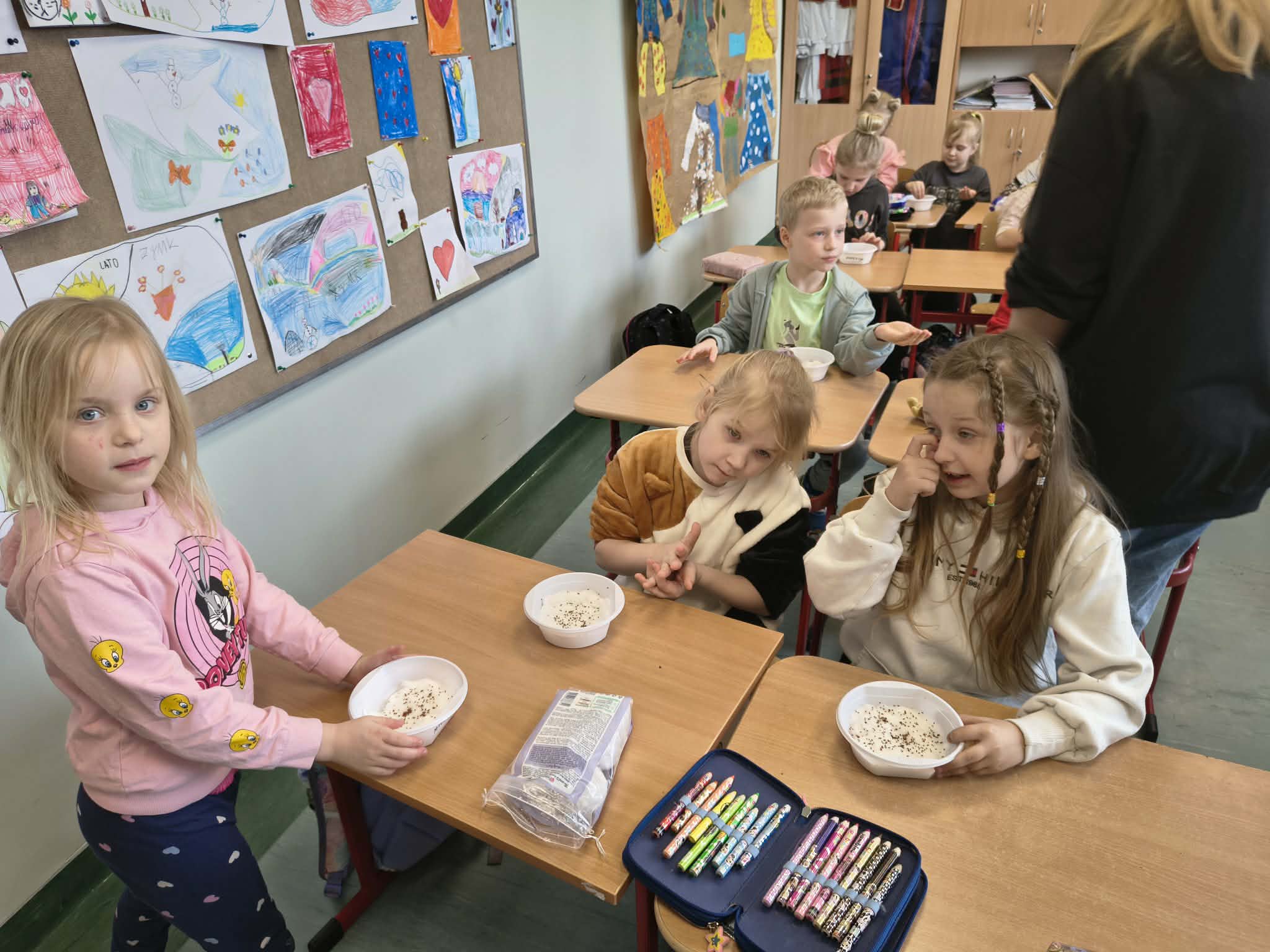 Nie zabrakło też akcentów przyrodniczych i świątecznych – każdy uczeń z zaangażowaniem siał rzeżuchę oraz własnoręcznie wykonał uroczy koszyczek wielkanocny,