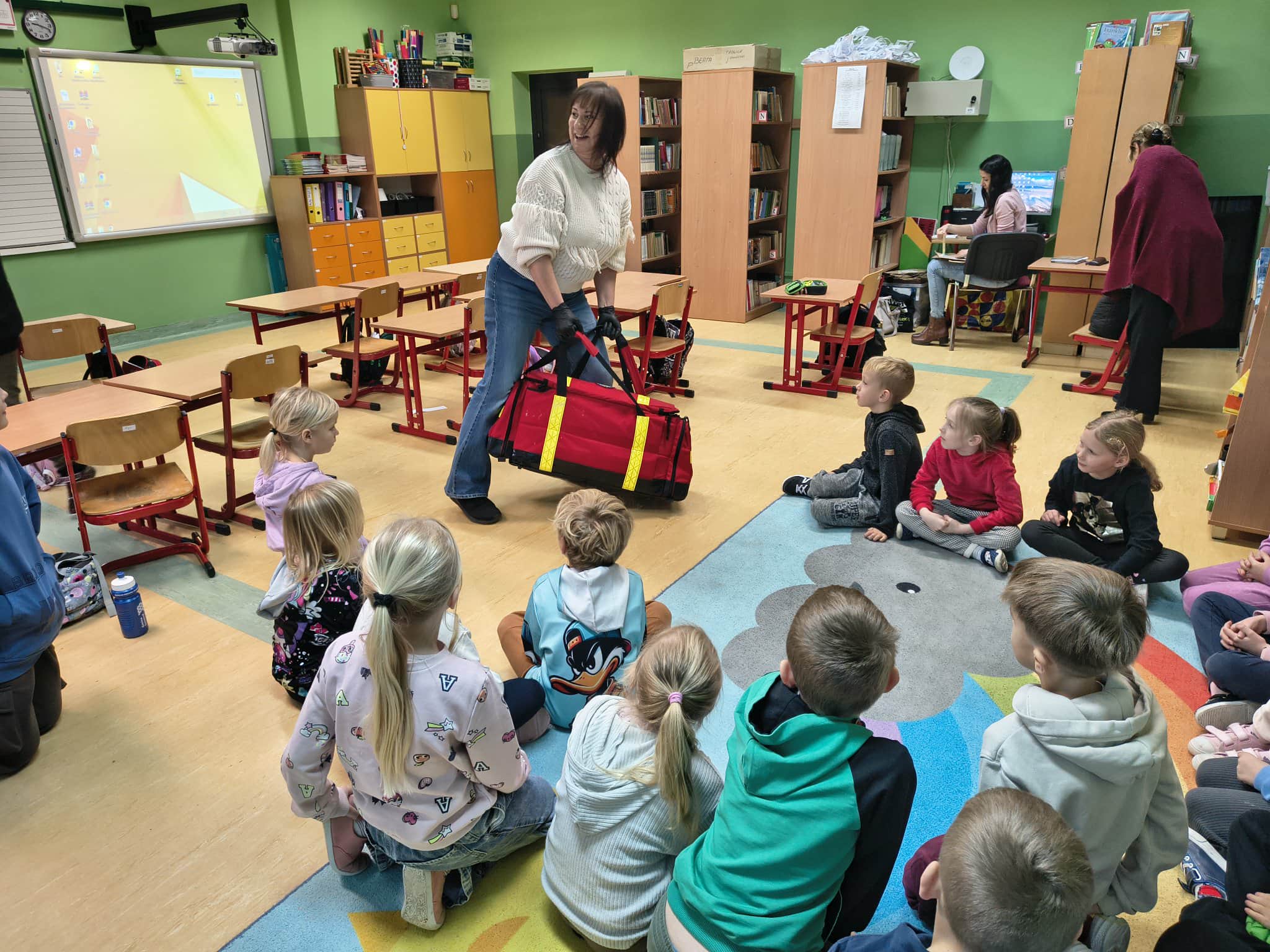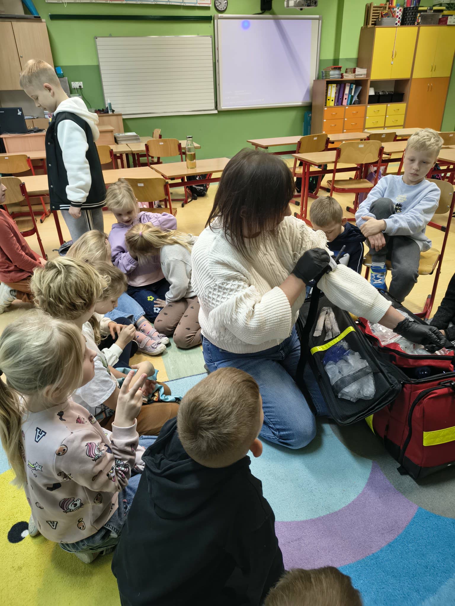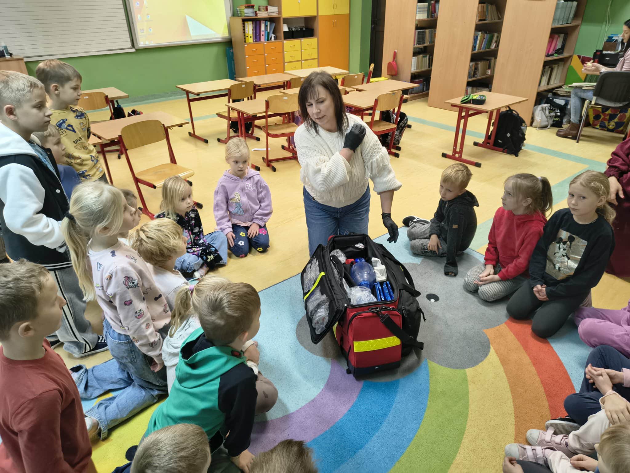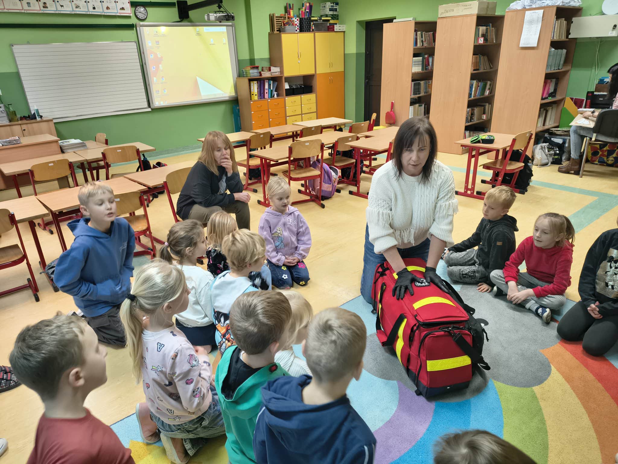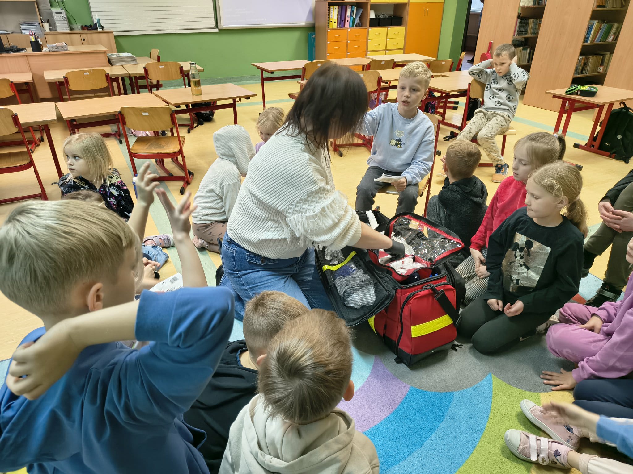 W ubiegły czwartek uczniowie klasy I i II uczestniczyli w zajęciach z panią Anią, dotyczących podstawowych zagadnień z zakresu Kwalifikowanej Pierwszej Pomocy. Podczas spotkania dzieci dowiedziały się, na czym polega praca ratownika oraz jakie działania podejmuje on w sytuacjach nagłych.