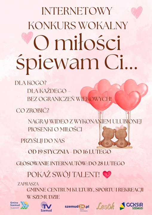 Gminne Centrum Kultury, Sportu i Rekreacji w Szemudzie serdecznie zaprasza wszystkich miłośników muzyki i śpiewu do udziału w wyjątkowym Internetowym Konkursie Wokalnym pod hasłem "O Miłości Śpiewam Ci". To doskonała okazja, by zaprezentować swój talent wokalny, podzielić się emocjami i zainspirować innych pięknem muzyki o tematyce miłosnej.
