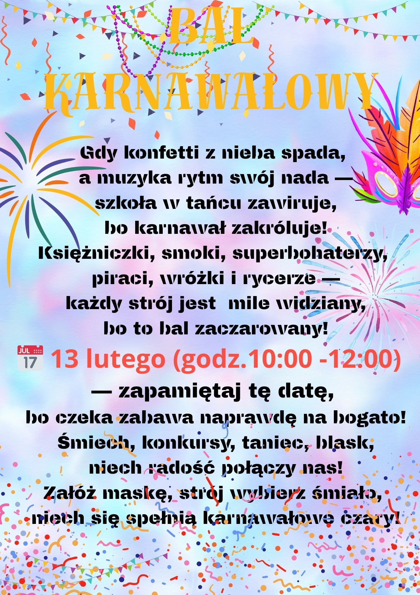 Serdecznie zapraszamy wszystkich uczniów na niezapomniany Bal Karnawałowy, który odbędzie się 13 lutego 2026 roku w godz. 10:00 - 12:00